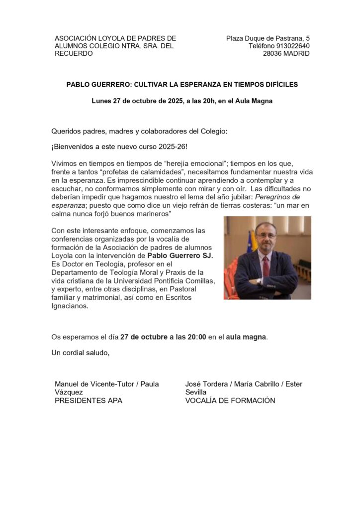 PABLO GUERRERO: CULTIVAR LA ESPERANZA EN TIEMPOS DIFÍCILES Lunes 27 de octubre de 2025, a las 20h, en el Aula Magna