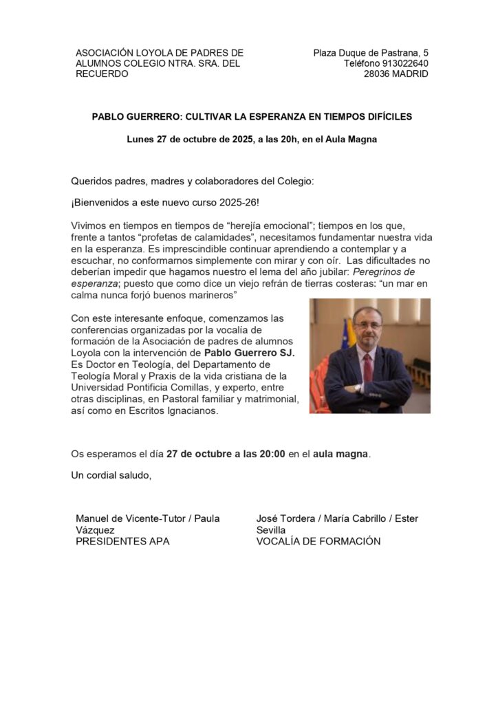 PABLO GUERRERO,SJ: CULTIVAR LA ESPERANZA EN TIEMPOS DIFÍCILES Lunes 27 de octubre de 2025, a las 20h